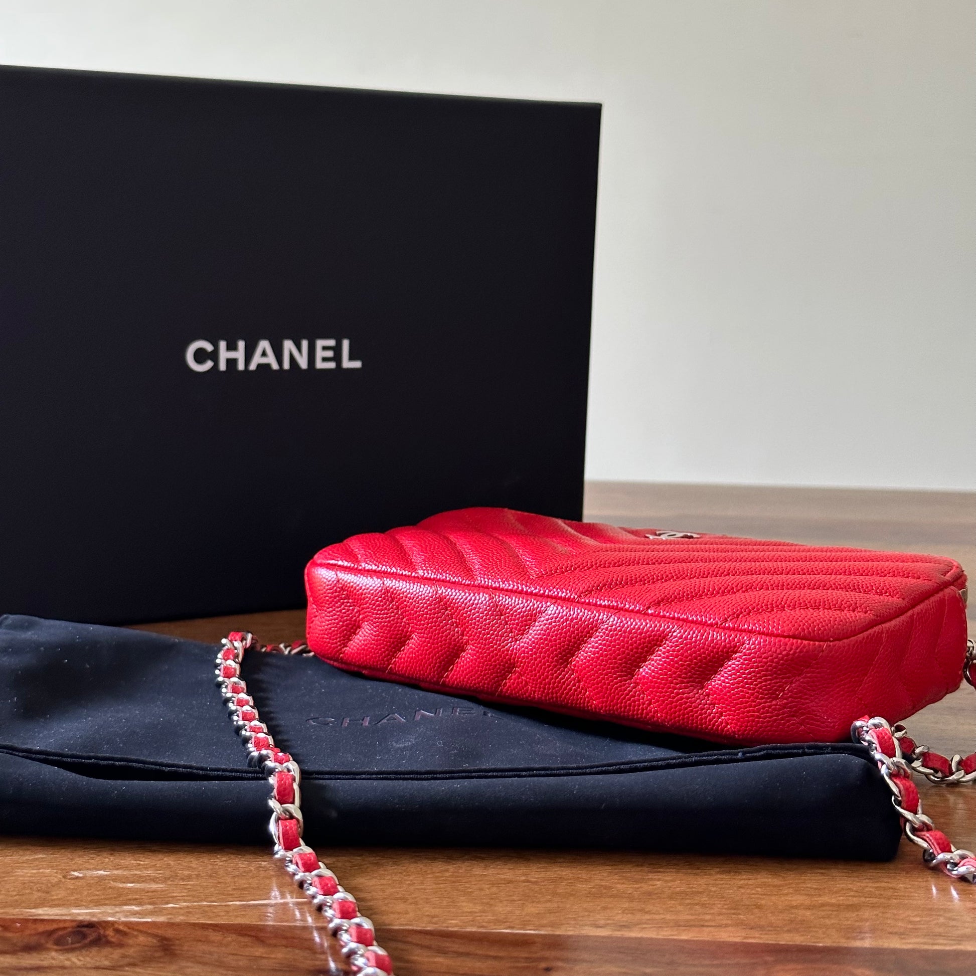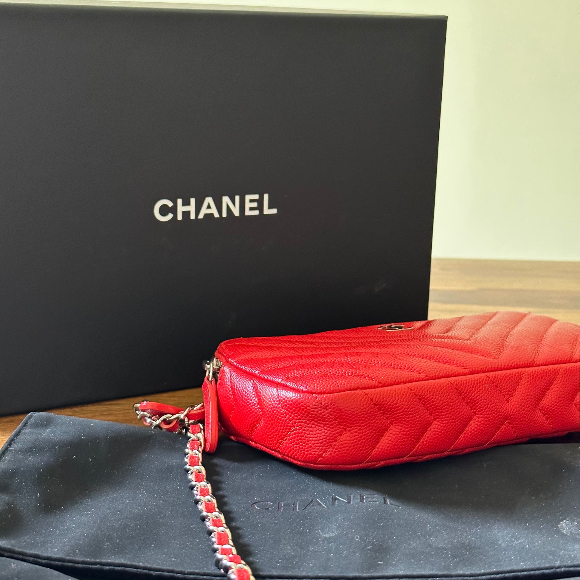 Chanel Red Caviar Leather Double Zip Wallet on Chain